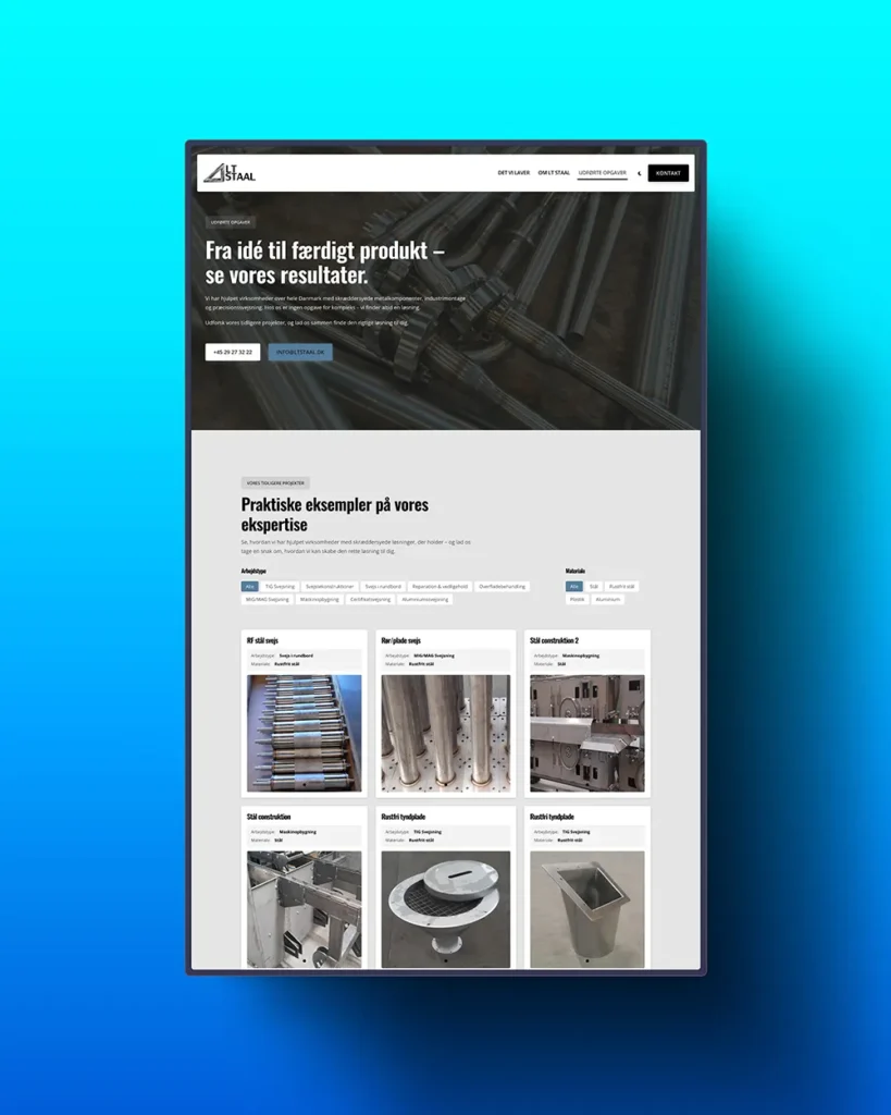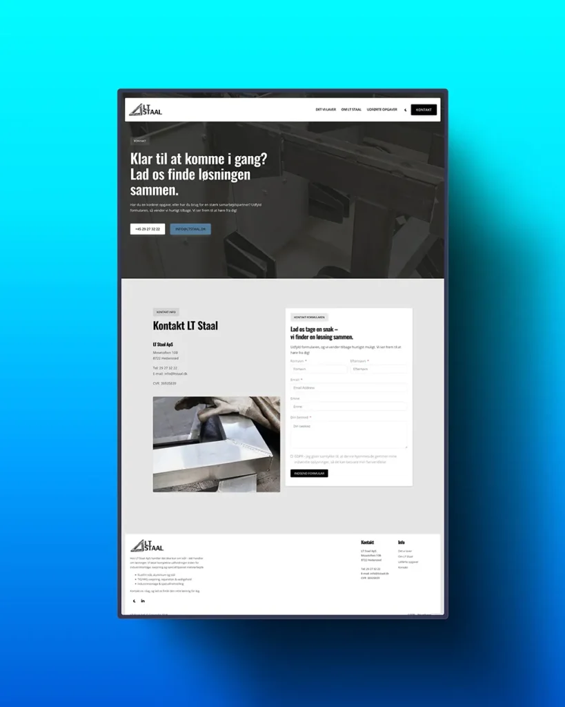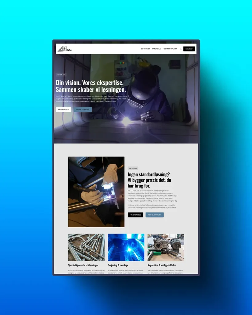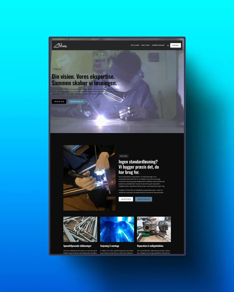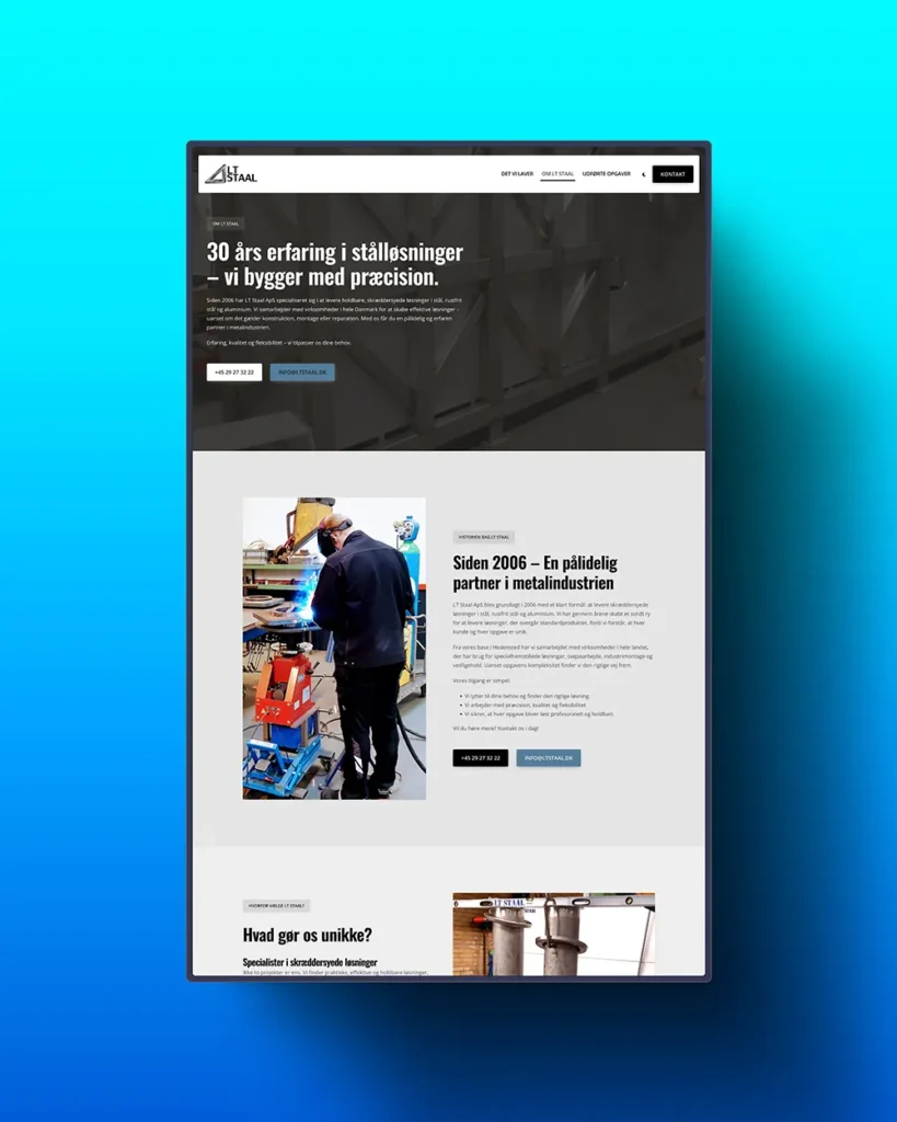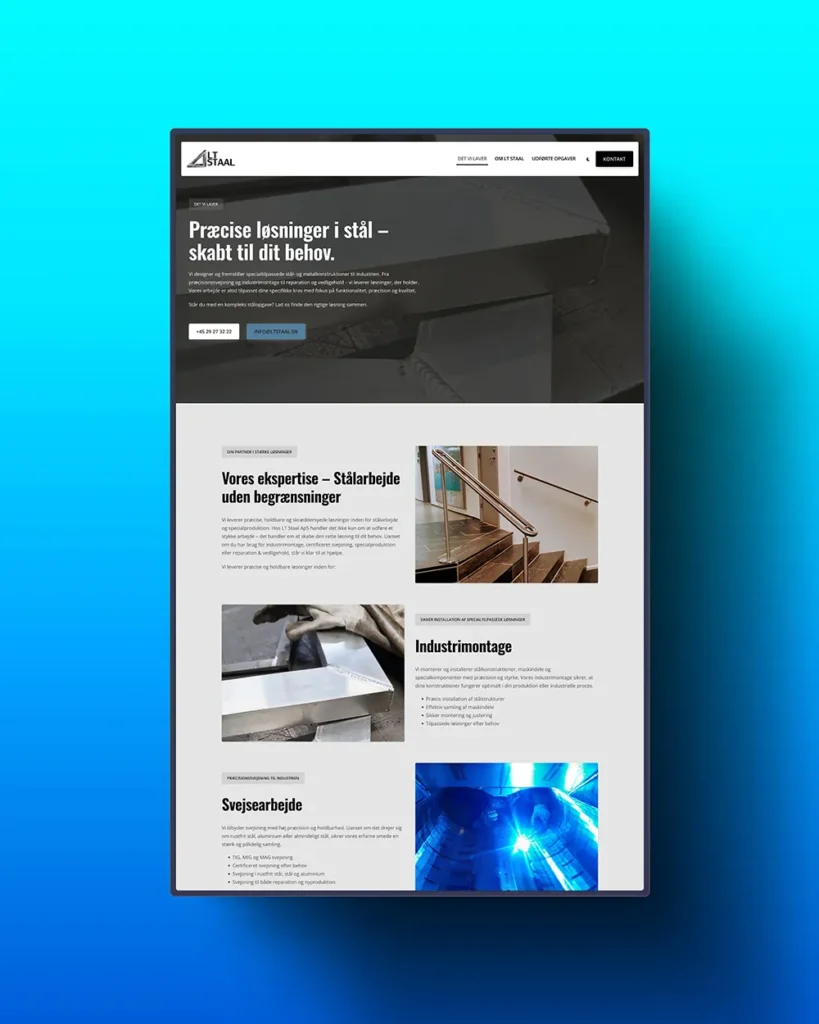 LT Staal ApS ønskede en moderne og mere visuelt engagerende hjemmeside, der kunne styrke deres online tilstedeværelse og gøre det nemmere for potentielle kunder at navigere og finde information. Der var særligt fokus på brugervenlighed, hastighed og søgemaskineoptimering.